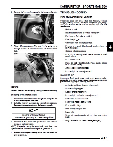 This is the same manual your local dealer will use when doing a repair. The manual for the Polaris Sportsman 500 EFI, X2, Touring,500 H.O has detailed illustrations as well as step by step instructions. All pages are printable, so run off what you need and take it with you into the garage or workshop. These manuals are your number one source for repair and service information. They are specifically written for the do-it-yourself as well as the experienced mechanic. Using this repair manual is an inexpensive way to keep your atv working properly. Each manual provides step-by-step instructions based on the complete dis-assembly of the machine. It is this level of detail, along with hundreds of illustrations, that guide the reader through each service and repair procedure.